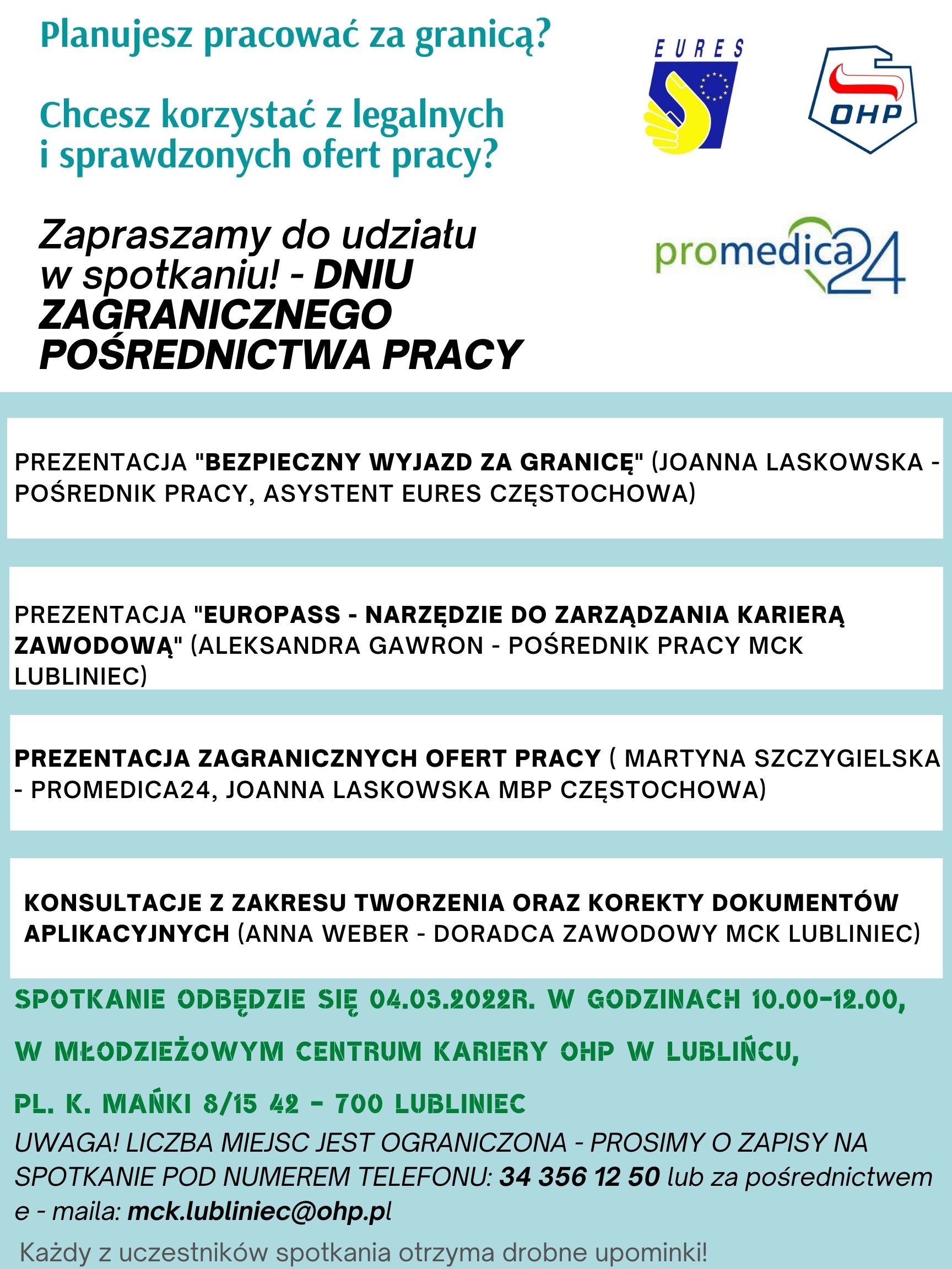 Młodzieżowe Centrum Kariery Ochotniczych Hufców Pracy w Lublińcu Pl. K. Mańki 8, 42 – 700 Lubliniec tel.: (34) 356 12 50 zaprasza do udziału w spotkaniu – Dniu Zagranicznego Pośrednictwa Pracy które odbędzie się 04.03.2022r.